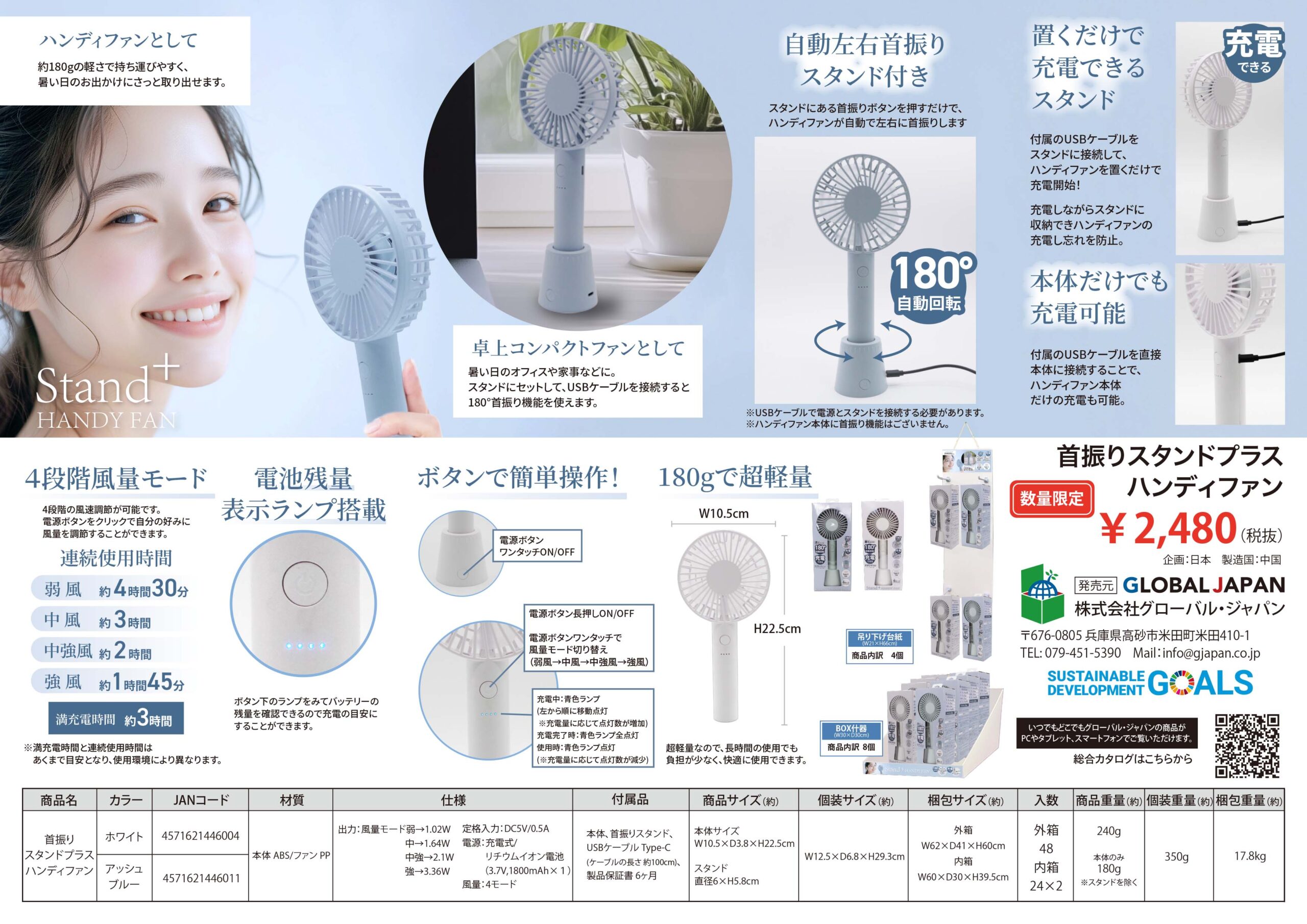 ハンディファンとして約180gの軽さで持ち運びやすく、 暑い日のお出かけにさっと取り出せます。 自動左右首振り スタンド付きでスタンドにある首振りボタンを押すだけで、 ハンディファンが自動で左右に首振ります 置くだけで充電できるスタンド 付属のUSBケーブルをスタンドに接続することで、 ハンディファンを置くだけで充電開始 4段階風量モード 【カラー】 ホワイト アッシュブルー